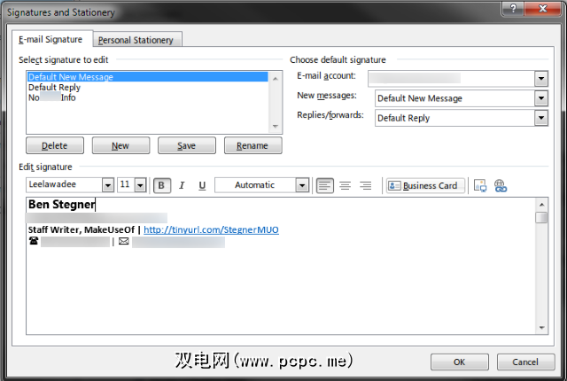 在这里,您可以使用新建按钮创建多个签名。每个都会在上面的框中添加一个新条目。在右侧,您会找到新消息和答复/转发对话框。这些允许您为这些类型的消息分配特定的签名。