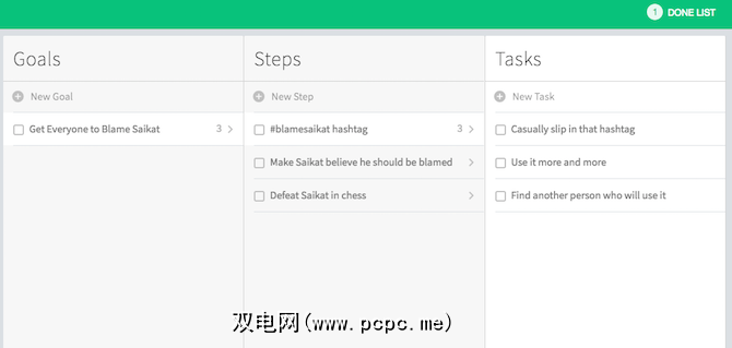 待办事项列表位于三个窗格中:目标,步骤和任务。使用起来很直观。首先写下你的目标。然后在第二列中,编写完成该目标所需的步骤。最后,对于每个步骤,编写您需要完成的任务。因此,在任何时候,您仅关注单个目标的单个步骤中的微小任务。现在不是那么令人不知所措,是吗?同时,将所有已完成的动作收集到一个“完成的列表"中,以使自己感到完成。