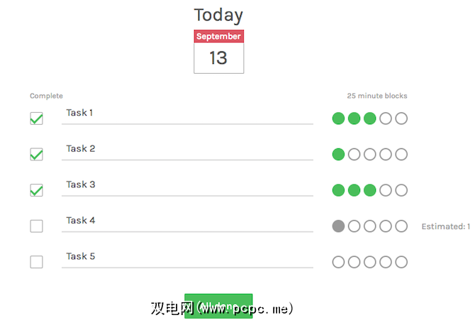 该应用程序使您可以创建包含五项的每日任务列表,且不得超过五项。您需要估计每个任务将花费25分钟的生产率间隔。这基于番茄技术。完成任何任务后,请选中复选框并添加实际花费的间隔时间。