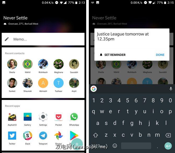 从天气开始,这里有一个便笺本,用于编写备忘录,您甚至可以在这些备忘录上附加提醒。下面是最近的联系人和最近的应用程序小部件,然后是有关数据,存储和电池电量的快速统计信息。