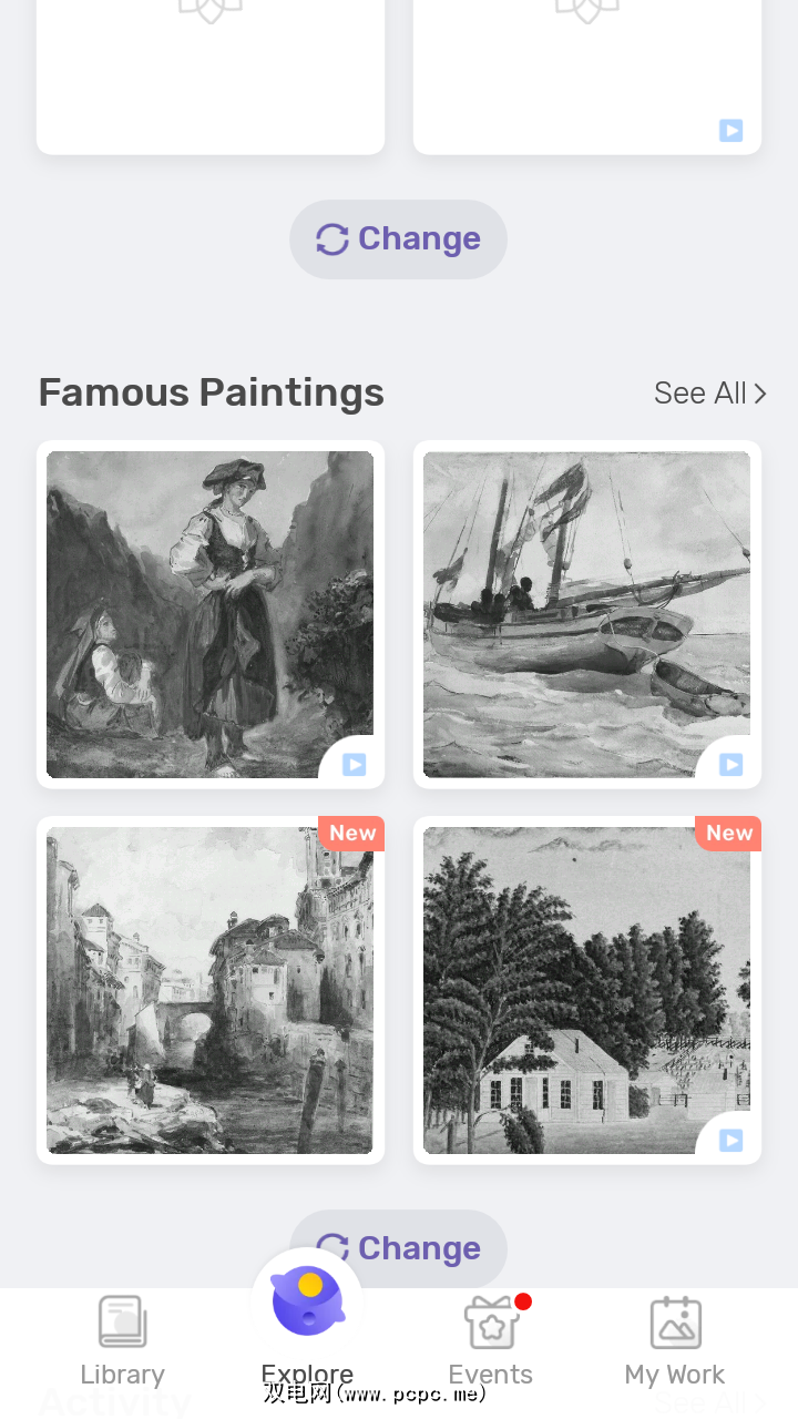 该应用程序有一个名画部分,您可以在其中为各种名画着色。在“探索”菜单中,您可以查看当年的热门图片。