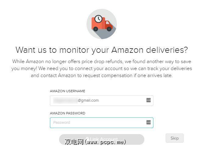在完成注册过程之前,Paribus会询问您是否也要链接您的Amazon帐户以进行后期交付监控。这是一个可选步骤,您稍后可以填写信息。