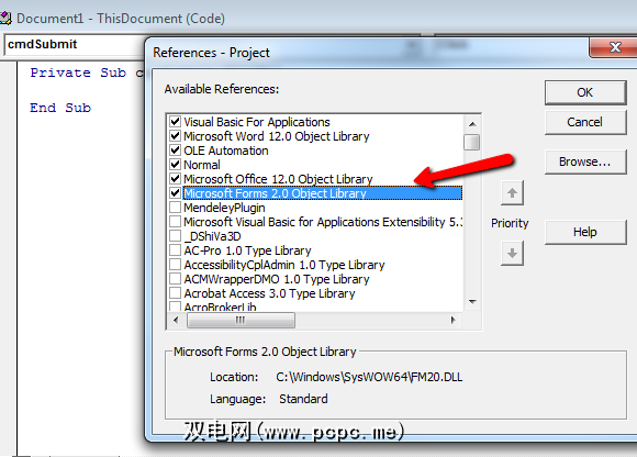 下一步,您将需要创建Excel文件在上面的Shell命令中打开的文件。在Excel中,您将要添加对“ Microsoft Forms 2.0对象库"的相同引用,然后在Workbook.Open()函数中,可以运行以下脚本。