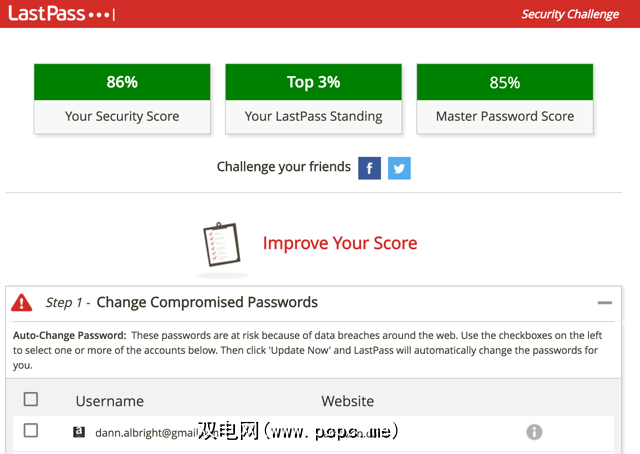 LastPass的“安全挑战"甚至可以通过查看每个密码的强度(可能被破坏的网站,旧的密码)来告诉您密码集合的安全性密码,以及数据库中的重复项数量,这将有助于您识别并消除多次使用过的重复项。