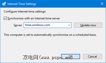 启用此功能意味着您的系统将每周一次或在系统启动时与选定的Internet时间服务器自动同步,以先到者为准。如果您收到Windows无法与时间服务器同步的错误,则可以使用 Server 下拉菜单从列表中选择其他服务器。