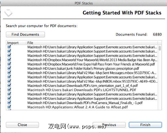 安装该程序后,可以使它能够定位和导入在计算机上发现的所有PDF。如果找到数千个PDF,而您又不想花时间过滤要导入的PDF,则只需关闭“导入"窗口,然后在菜单栏中使用文件>导入PDF文件…。 “ PDF堆栈"会将导入的PDF复制到其自己的文件目录/文件夹中,该文件目录/文件夹会自动添加到“文档"文件夹中。