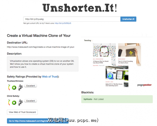 为获得更安全的浏览体验,请将缩短的链接复制并粘贴到UnshortenIt,您会发现原始URL,页面的摘要或描述(如果有)以及Web of Trust提供的安全等级。