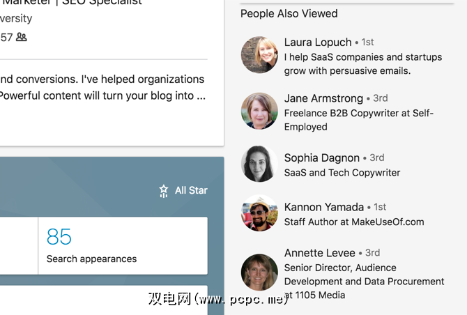 转到您的LinkedIn个人资料,然后在右侧查找“同时也查看过的人"部分: