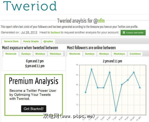 Tweriod的报告中包含有用的信息。它会告诉您在一周中的每一天发送推文的最佳时间(基于大多数关注者的在线时间),并告诉您何时发推文的风险最高。