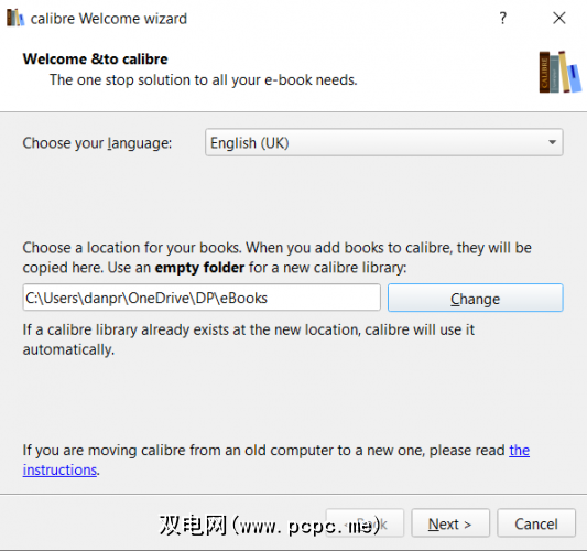 在向导的第一个屏幕上,系统将提示您输入电子书库的位置。按下 Change (更改),然后导航到您刚刚创建的父文件夹。
