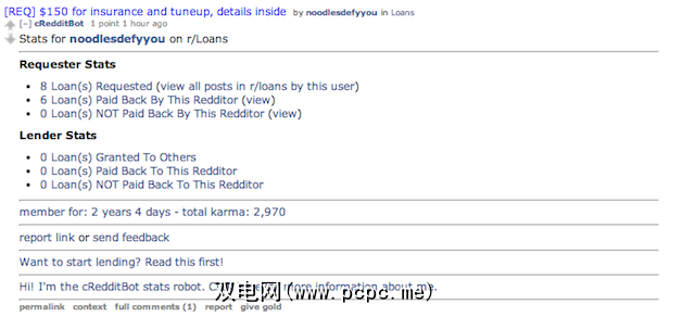 信用评级甚至是最基本的形式。适当命名的Credditbot会查看用户的业障,以及用户在/ r / loans subreddit上的先前借贷活动。当某人在subreddit上提交贷款请求时,Crdditbot会自动将这些统计信息发布为帖子的评论。