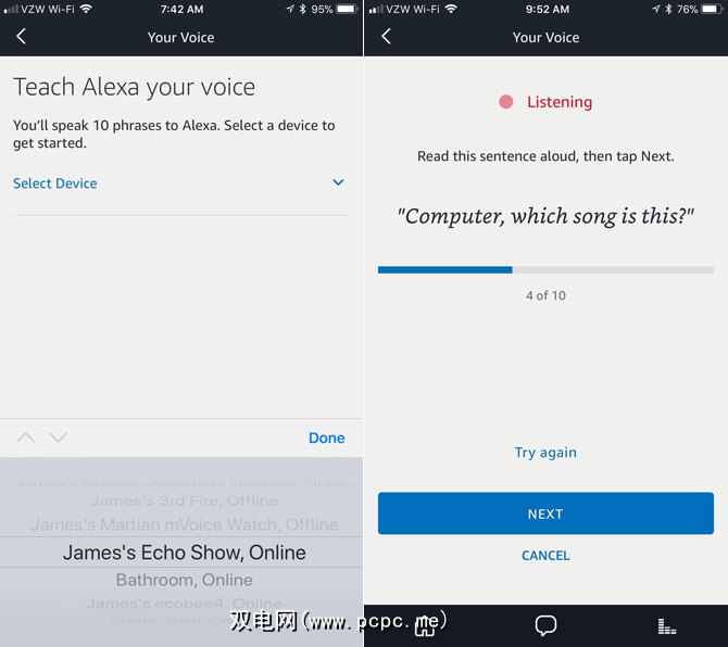 在培训期间,您将为Alexa说10个不同的短语。按下一步循环浏览每个短语。亚马逊建议您使其他任何语音设备静音,并在安静的地方从正常距离与Alexa通话。