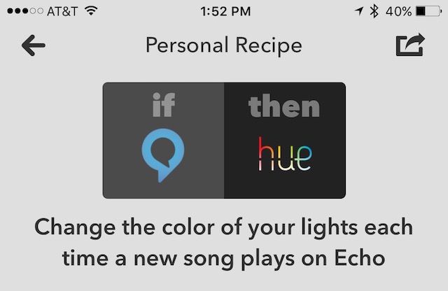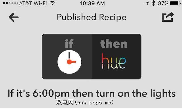 连接后,您将看到与Philips Hue一起使用的“常用食谱"列表。从此列表中选择您要使用的一个。例如,选择如果是下午6:00,则打开灯光。在此屏幕上,系统会要求您选择要遵循的食谱的光。