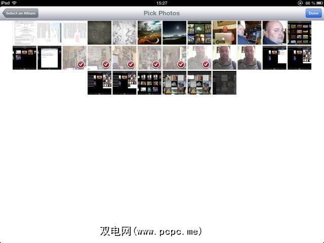点击所需的照片进行上传时,它们将变暗,并且会出现红色的小箭头。然后,选择右上角的蓝色 Done 按钮。