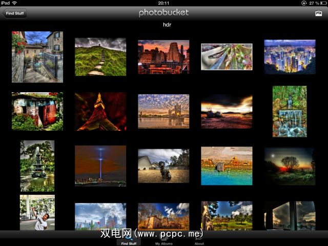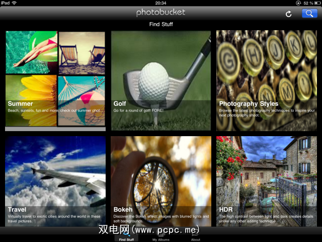 Photobucket的iOS应用程序向您致意打开时具有一个非常吸引人的界面。 “查找资料" 标签由不同的面板组成,每个面板包含一类照片。在面板上点击可打开照片缩略图的完整列表,然后您可以点击以查看完整的图片。