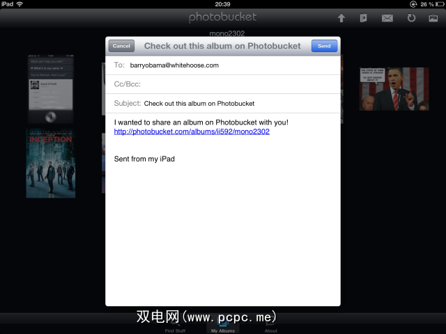 您可以通过发送电子邮件链接快速共享相册。然后,该链接指向Photobucket网站上的相册。只需选择共享按钮,电子邮件选项,就会弹出标准电子邮件窗口,其中的链接已经预先填充在电子邮件中。您所需要做的就是输入收件人的电子邮件地址,然后它就消失了。