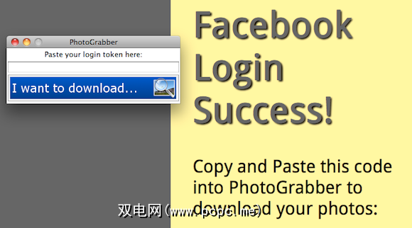 打开Photograbber时,您将看到一个简单的窗口,其中显示“ Login < / em>"。单击此按钮后,您将被带到浏览器中的Facebook身份验证页面,以便您可以授予Photograbber获取照片所需的访问权限。