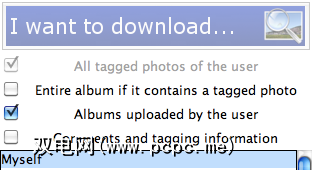 Photograbber程序实际上允许您在Facebook上下载可以访问的任何照片。因此,您需要确保从人员列表中选择“ 我自己"。您还可以从此处选择其他一些选项,例如,是否下载所有相册或仅标记了您的任何照片,是否在一张照片中标记了所有的相册(例如,下载到从您参加的聚会中获取所有照片)。您还可以根据需要选择获取所有注释和标记信息。