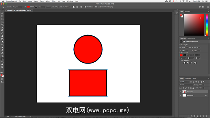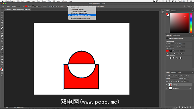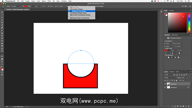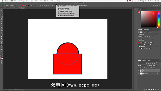 首先在画布上绘制一个形状。接下来,点击屏幕顶部选项栏中的路径操作按钮。通常,每个新路径或形状都会进入其自己的层。通过单击组合形状进行更改。