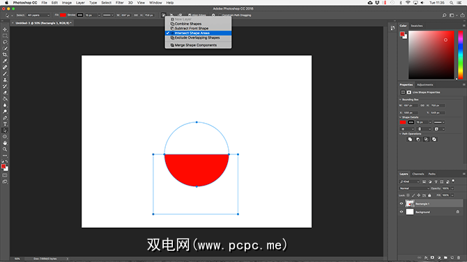 突出显示这两个形状。在路径操作中,选择相交形状区域。除了它们重叠的区域之外,这将删除这两个形状。我们正在使用此选项创建一个半圆。