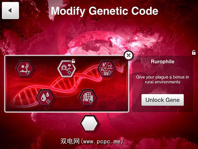您将被邀请给您命名疾病,并立即释放出来。世界上就有机会修改遗传密码。这些可选基因提供了好处,例如通过某种运输方法传播的机会增加,对某种气候的抵抗力等等。这些也是可解锁的,您在使用它们之前必须先发现它们,或者,如果您感到懒惰,那么您可以为每个基因支付0.99美元或为7.99美元来解锁所有30种。