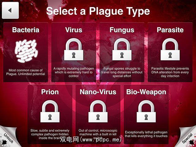 首次启动游戏时,您只能选择创建细菌。共有7种“正常"瘟疫类型,从病毒(快速变异,难以控制)到生物武器(异常致命),以及7种单独的“特殊"瘟疫,包括神经ura蠕虫(钻入大脑)和作弊行为。例如阻止政府干预并否认治愈可能性的病毒。通过在Plague Inc.的各种游戏中玩耍,您将解开各种疾病类型。