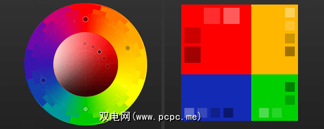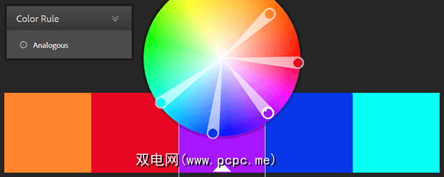 像帕莱顿一样,首先选择一种颜色规则:单色,类比,三合色,互补色,化合物或阴影。然后,当您在颜色选择周围拖动时,其他颜色会自动调整以适合所选的颜色规则。