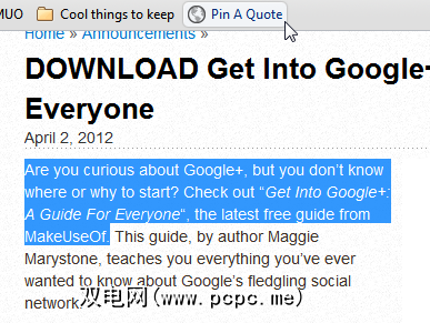 首先,请访问pinaquote.com,并将小书签拖到书签栏。下次找到喜欢的报价时,只需突出显示文本并单击“ Pin A Quote "书签即可。