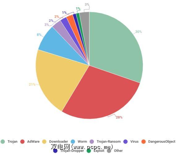 下载程序和广告软件感染占恶意文件的49%,尽管它们并不是严格意义上的恶意软件(但确实会干扰正常的系统运行)。