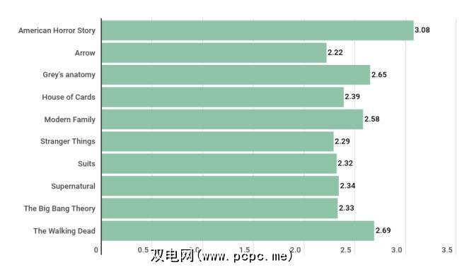 运行GoT的时间非常接近,第二个是您所猜测的“行尸走肉"。另一个热门节目显示:a)粉丝们买的不够多,b)最初的广播范围有限,这使人们寻找盗版内容。 CWs Arrow排名第三。请参阅上表以查看从2017年到2018年的变化。
