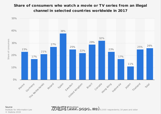 不仅仅是美国,俄罗斯和印度。以下Statista图表显示了2017年通过非法渠道消费电影或电视连续剧的消费者所占的比例。