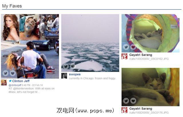 单击其中任何一个,您将根据屏幕的宽度平铺照片或视频的布局。这些带有上传者的名称和标题,以及两个快捷方式:在Twitter和“收藏夹"上共享。我将稍作讨论。
