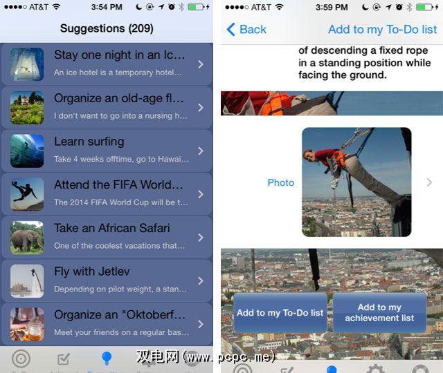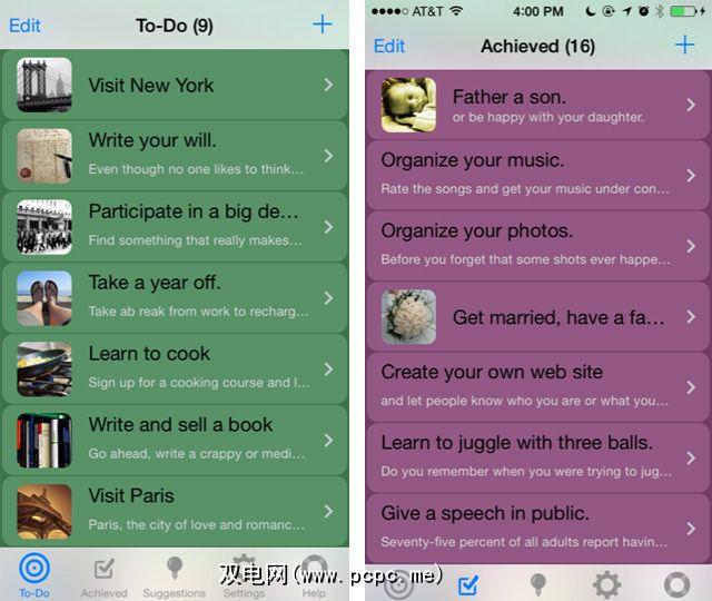 2DoBefore可让iOS用户轻松创建以下列表:他们一生想要完成的事情。该应用程序的广告支持的免费版本包括200多个建议,用于建议目标清单类型的目标-许多建议就像组织数字照片和纸质照片或撰写歌曲一样简单,可以实现更雄心勃勃的成就,例如攀登世界最高的七个峰会或参加