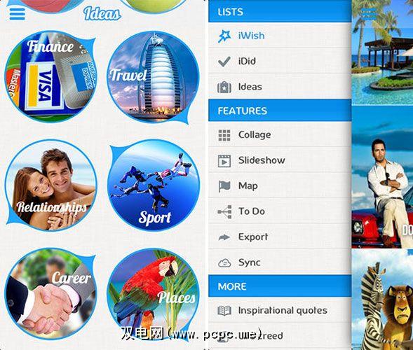 iWish还利用高度图形化的用户界面,具有庞大的目标库和与地点,人际关系,旅行,体育,职业,财务等相关的愿望。iWish的前100个创意包括学习如何打坐的长期目标,参观迪士尼乐园等显而易见的创意以及诸如停留在迪士尼乐园等更具冒险精神的创意。水下酒店。