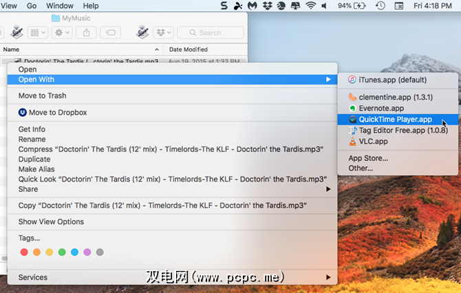 在Finder中,右键单击要播放的音频文件,然后转到打开方式> QuickTime Player.app 。