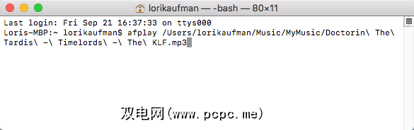 afplay /Users/lorikaufman/Music/MyMusic/Doctorin\ The\ Tardis\ -\ Timelords\ -\ The\ KLF.mp3如果路径或文件名中有空格,请在每个空格前加反斜杠。