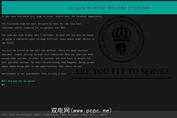 当您访问游戏的数字域时,会被问到“ 您适合服务吗?",然后点击“ 请继续"开始游戏。然后您会获悉,“ 以下考试旨在测试入学MI6所需的五个最重要技能。"“ 仅通过每个模拟并不意味着您拥有通过了该部分。为了成功,您将必须获得最佳的结果。警惕发生的一切。成为MI6代理意味着能够看到别人看不到的机会。"