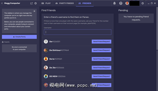 要添加朋友,请访问Parsec中的“朋友"选项卡。您可以查找朋友的用户名,也可以使用其唯一的Parsec ID。在其“ Parsec"窗口的用户名下可以找到该号码。