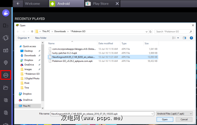 要安装KingRoot,请打开BlueStacks,单击左侧的 APK 符号,< strong>打开计算机上相应的APK文件,KingRoot将自动安装。