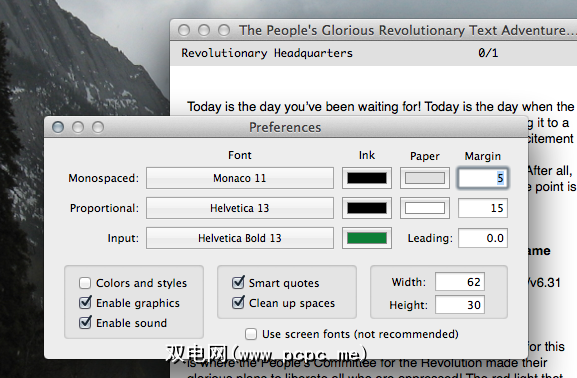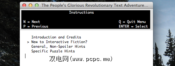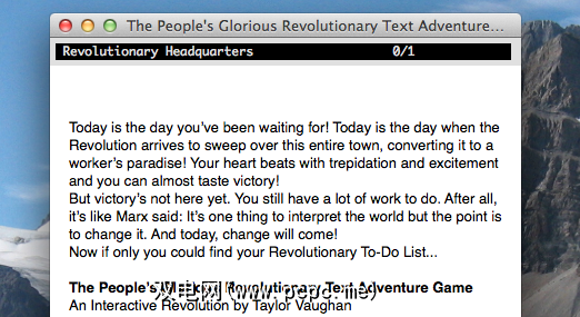 安装Spatterlight,它将成为打开几乎所有您下载的交互式小说文件的默认程序。打开任何文件,您可以立即开始播放。这是我在尝试“人民的光荣革命文字冒险游戏",它是一个模仿苏联双关语的快速模仿游戏。