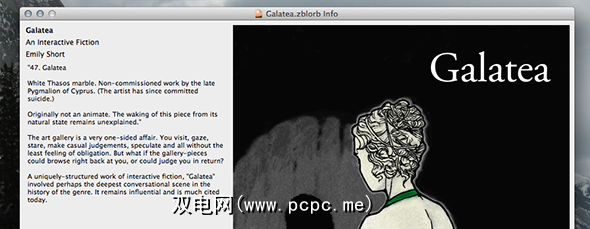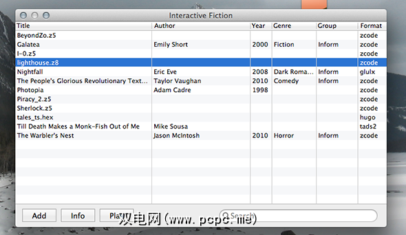 该应用程序不仅是打开交互式小说游戏文件的简便方法,它还这也是组织游戏收藏的好方法。单击 Window ,然后单击 Interactive Fiction ,您将看到此库: