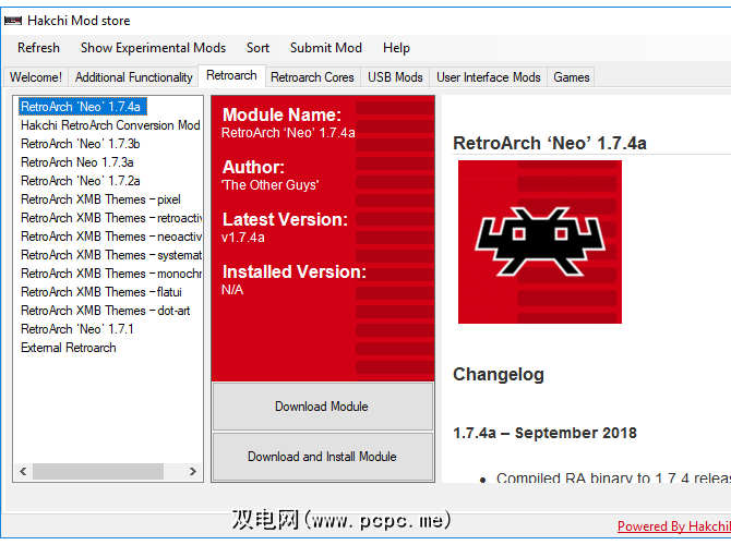 转到 Modules> Mod Store ,然后进入 Retroarch 标签。选择 RetroArch'Neo'的最新版本(可能是顶部条目),然后单击下载并安装模块。