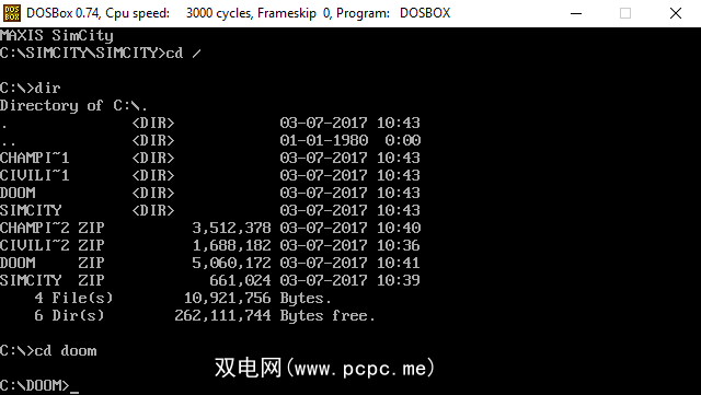 例如,假设您想在DOSBox中玩 SimCity 。您访问了一个网站,该网站提供了一些废弃软件游戏,这些游戏可以下载到硬盘驱动器上的 C:\ dosgames 目录中。在DOSBox运行的情况下,安装驱动器,查看内容,然后使用 cd 导航到 simcity 目录,如下所示: