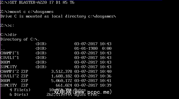 在安装和运行DOSBox时,您会看到 Z: \ 提示。这可以代替旧的 C:\>提示,该提示是指PC的硬盘驱动器。加载DOSBox后,您会看到一条提示,提示您将文件夹安装在物理PC上作为虚拟驱动器。使用mount命令执行此操作: