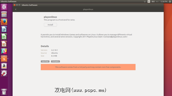 接下来,我们将安装PlayOnLinux。尽管PoL确实包括Wine作为其后端,但是Debian Wheezy用户Ubuntu(精确到更高版本)必须启用Wine的i386版本。转到PlayOnLinux下载页面,然后选择正确的软件包。当前软件包包括Debian,Fedora,Archlinux,Frugalware和Ubuntu。还有一个所有发行版选项。在使用Ubuntu 16.04时,我只单击了PlayOnLinux Debian软件包,并使用Ubuntu软件中心进行了安装。