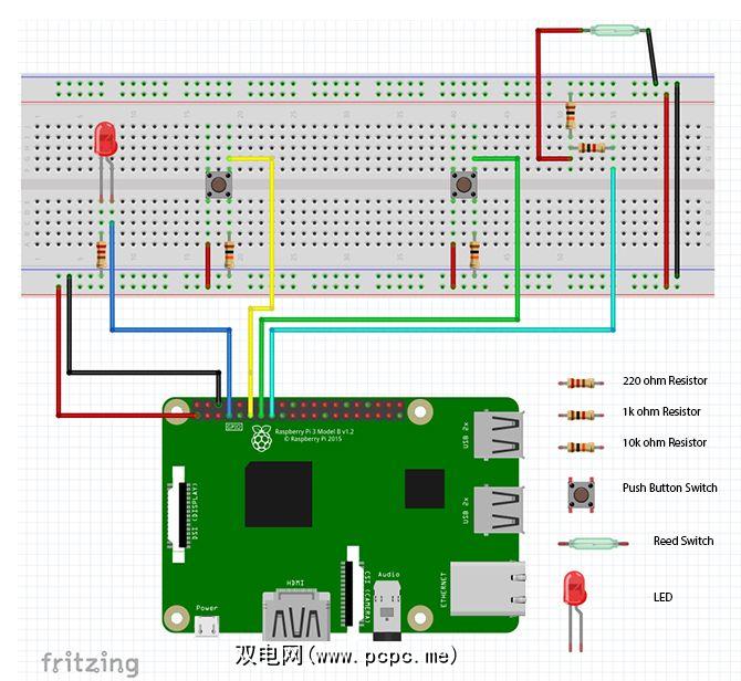 LED已连接到我们pi的引脚7。两个按钮开关分别连接到引脚11和13,舌簧开关连接到引脚15。我们的电源连接到引脚1(3v3)和引脚6(Gnd)。