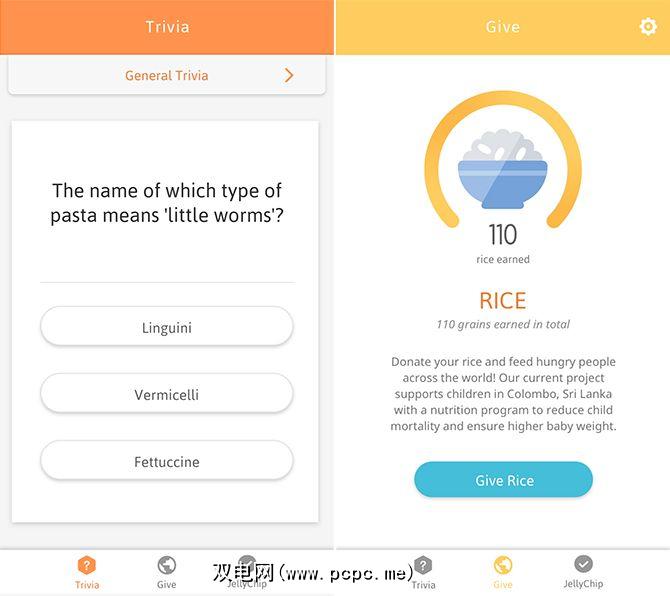 与其他iOS琐事应用程序不同,但是,对于每个遇到的问题,都会捐赠10粒米。当您正确回答问题并积累米粒时,您可以将这些米粒捐赠给当前计划。