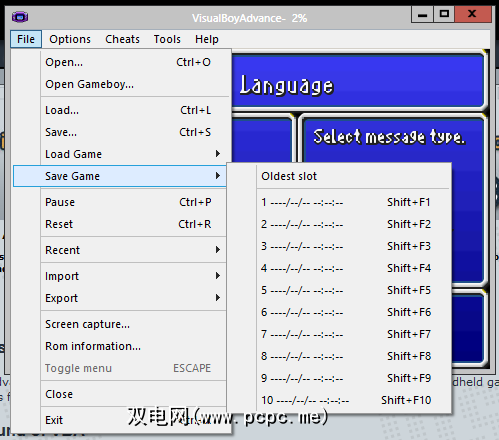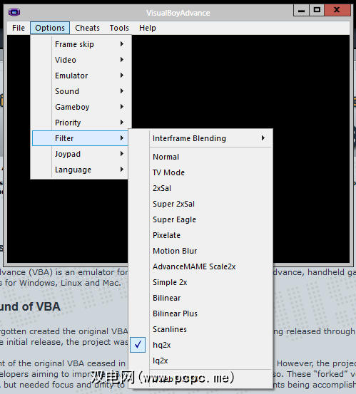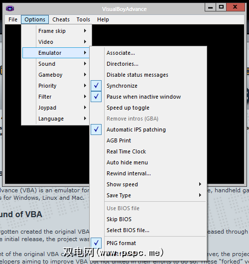 配置VBA几乎不像为大多数其他模拟器设置首选项那样困难。所有可配置的选项都可以通过 Options 菜单标题下的菜单进行访问。