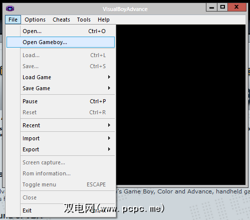 这非常简单明了。为Gameboy Advance ROM选择 Open…,为原始Gameboy和Gameboy Color ROM选择 Open Gameboy ... 。