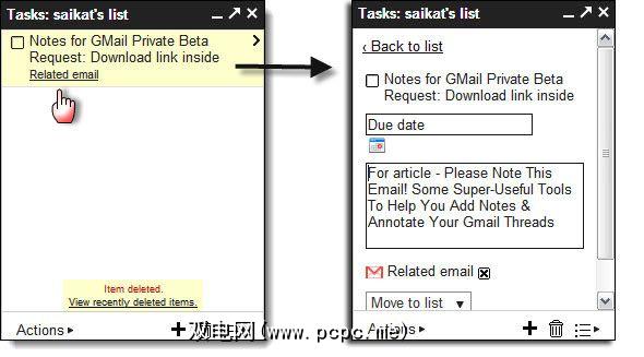 Gmail任务可让您发送任何Gmail线程到“任务"窗格(更多–添加到任务)。 “任务"列表上的每个项目都已连接到原始电子邮件,您只需单击相关电子邮件链接即可引用原始电子邮件。更重要的是,当您点击“任务"详细信息(通过“编辑详细信息")时,您会看到一个小框,仅供注意。 Gmail任务可帮助您将电子邮件转变为可操作的GTD作业,并添加注释可为它们提供额外的空间。